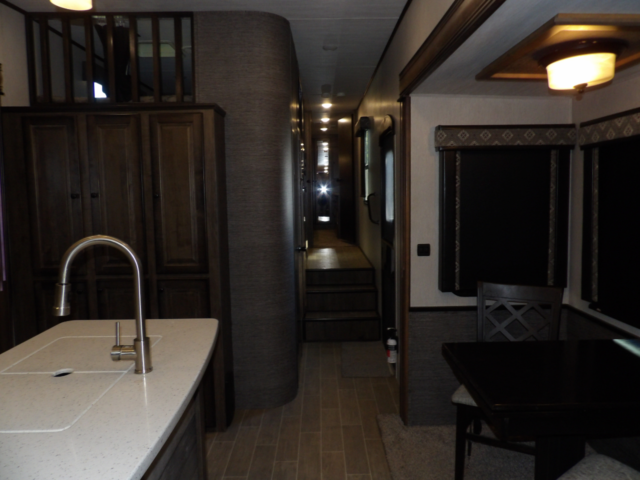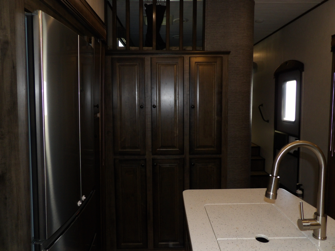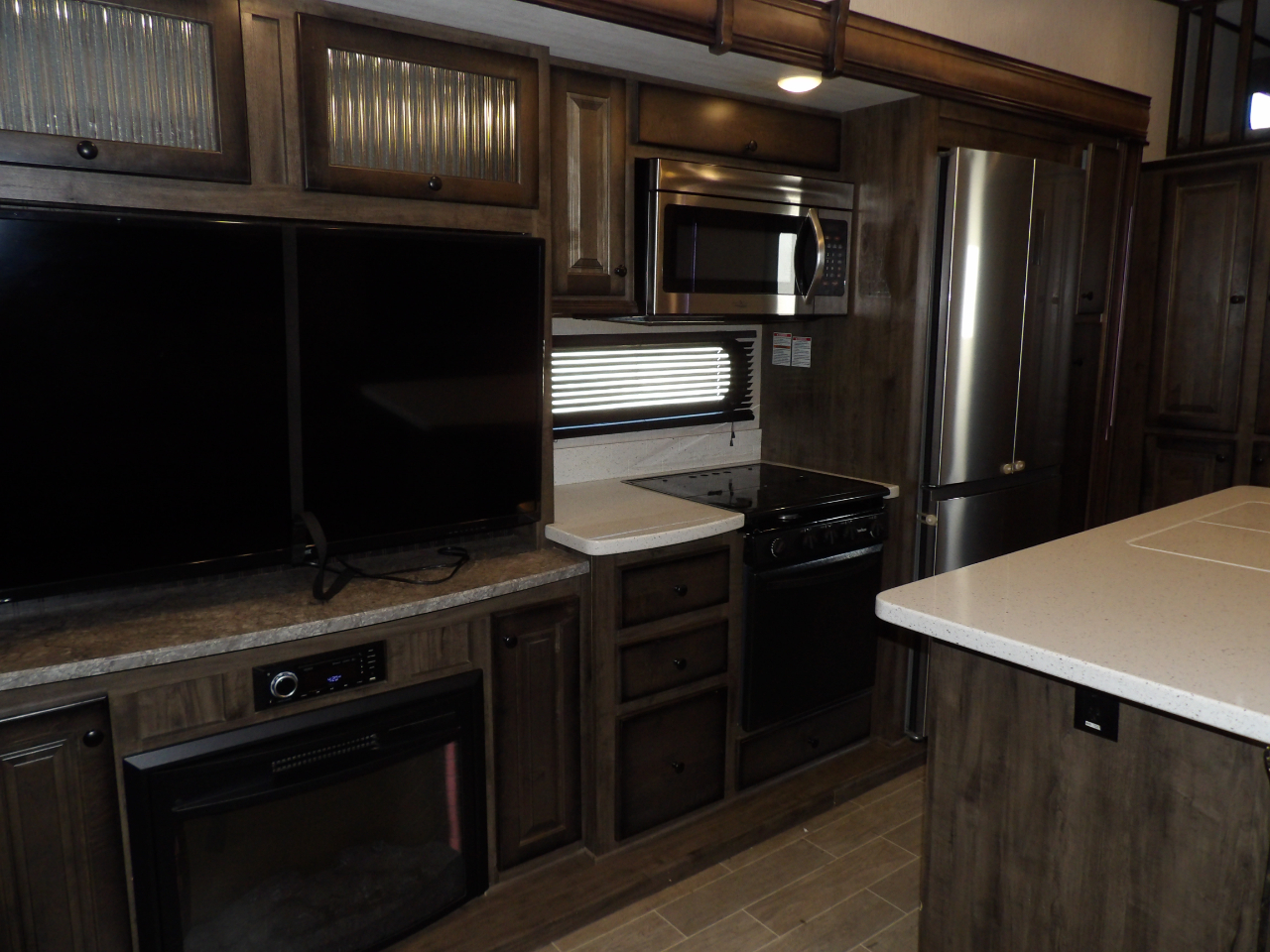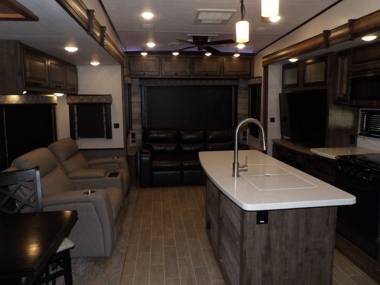 The heart of this fifth wheel is the kitchen, equipped with top-of-the-line stainless steel appliances, solid surface countertops, and ample storage for all your culinary essentials. Whether you're a seasoned chef or enjoy the occasional meal preparation, the Bighorn 39MB ensures every moment in the kitchen is a pleasure.