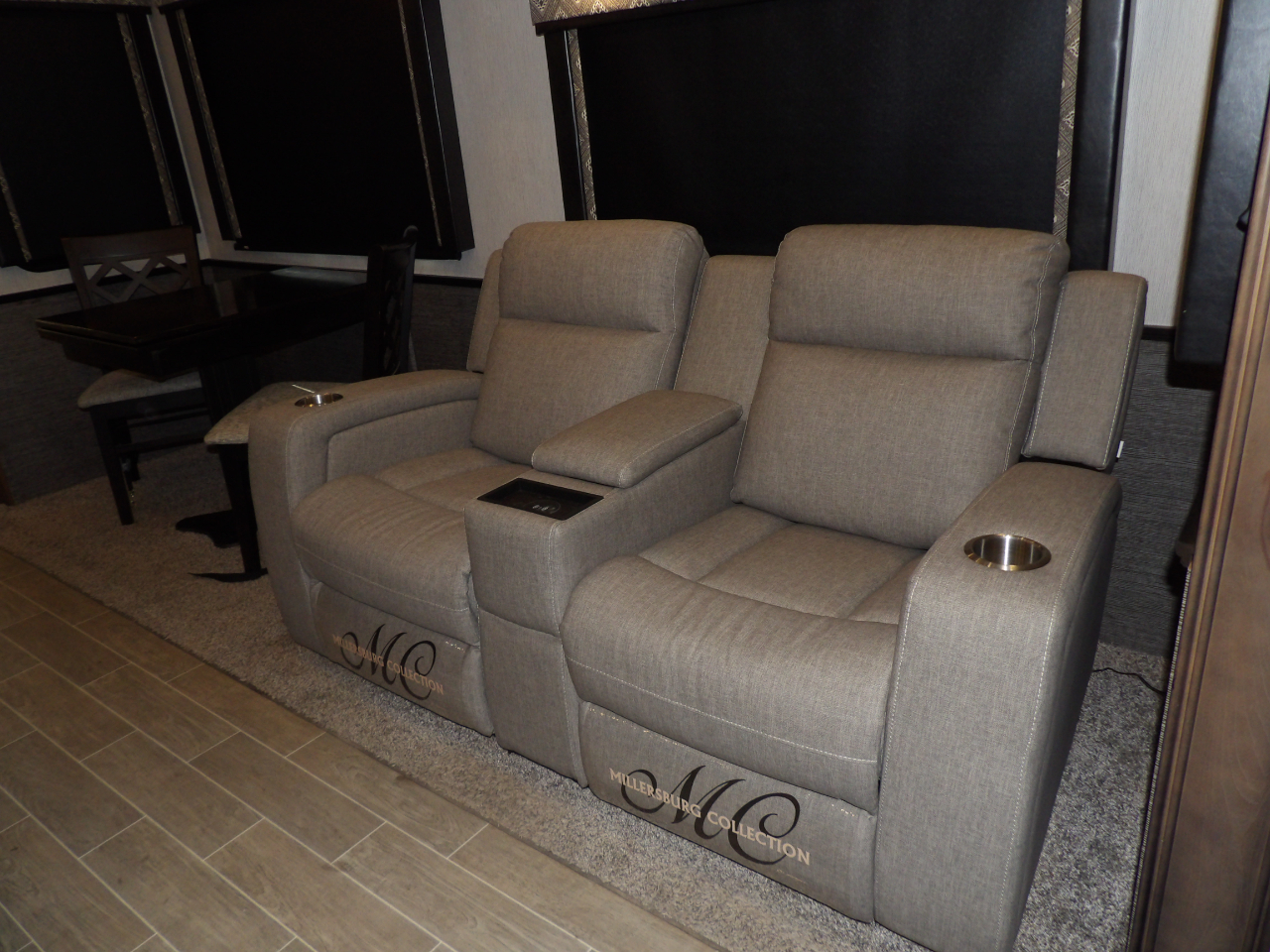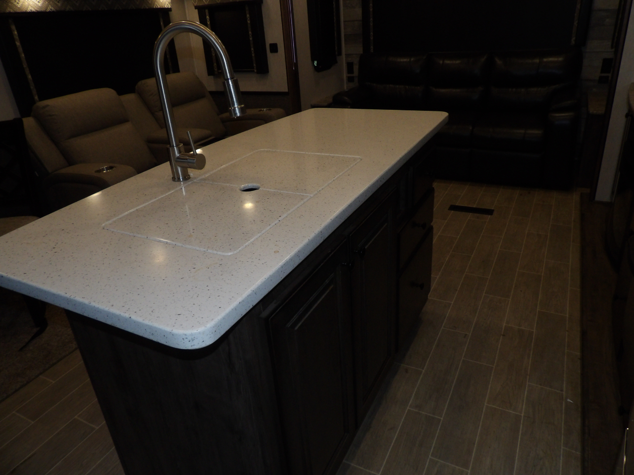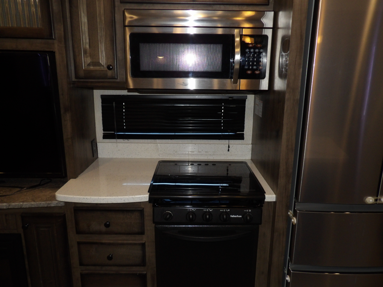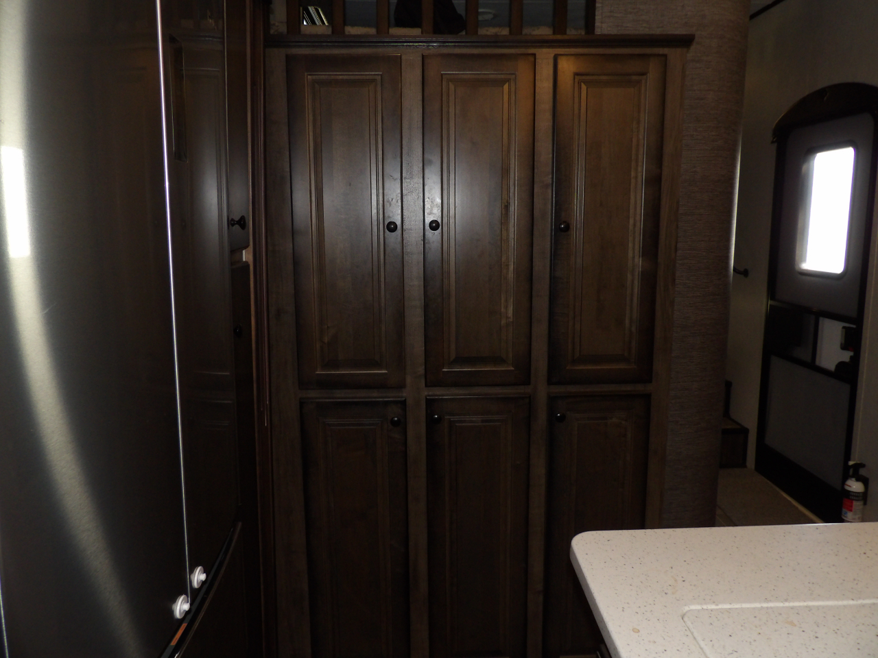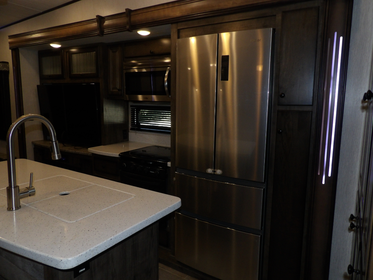 The heart of this fifth wheel is the kitchen, equipped with top-of-the-line stainless steel appliances, solid surface countertops, and ample storage for all your culinary essentials. Whether you're a seasoned chef or enjoy the occasional meal preparation, the Bighorn 39MB ensures every moment in the kitchen is a pleasure.