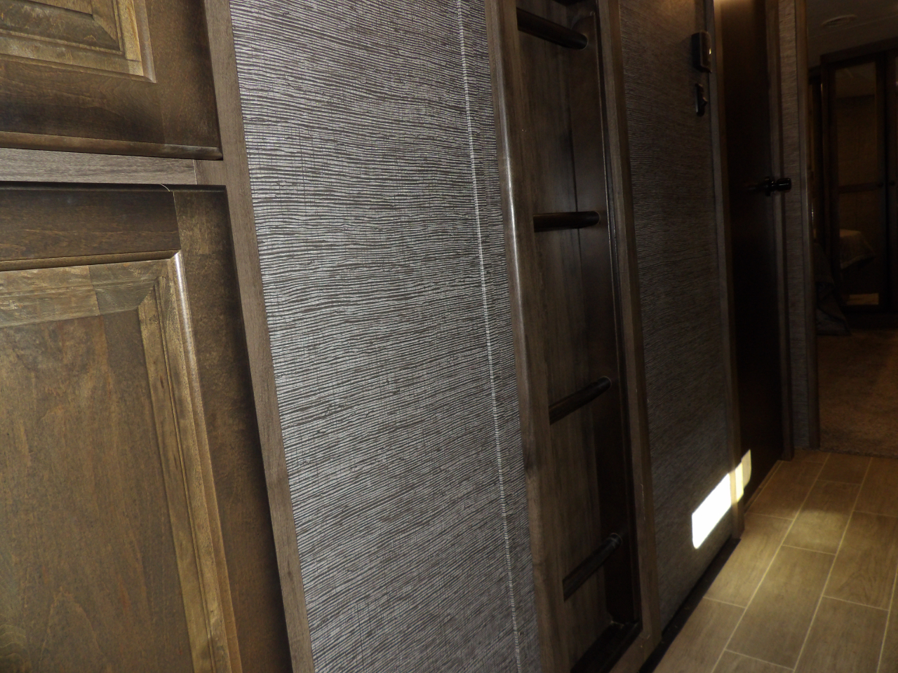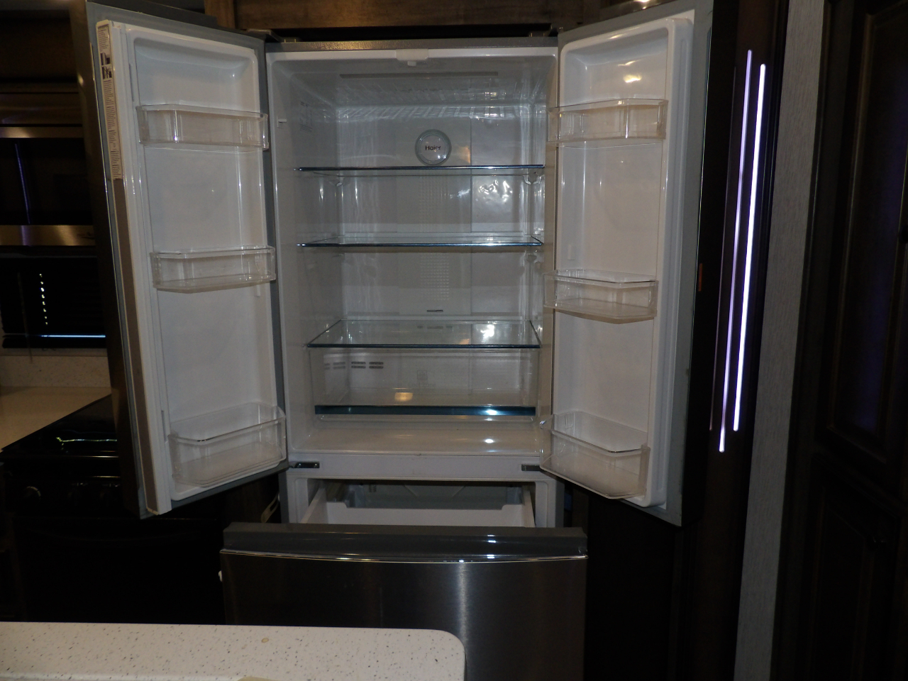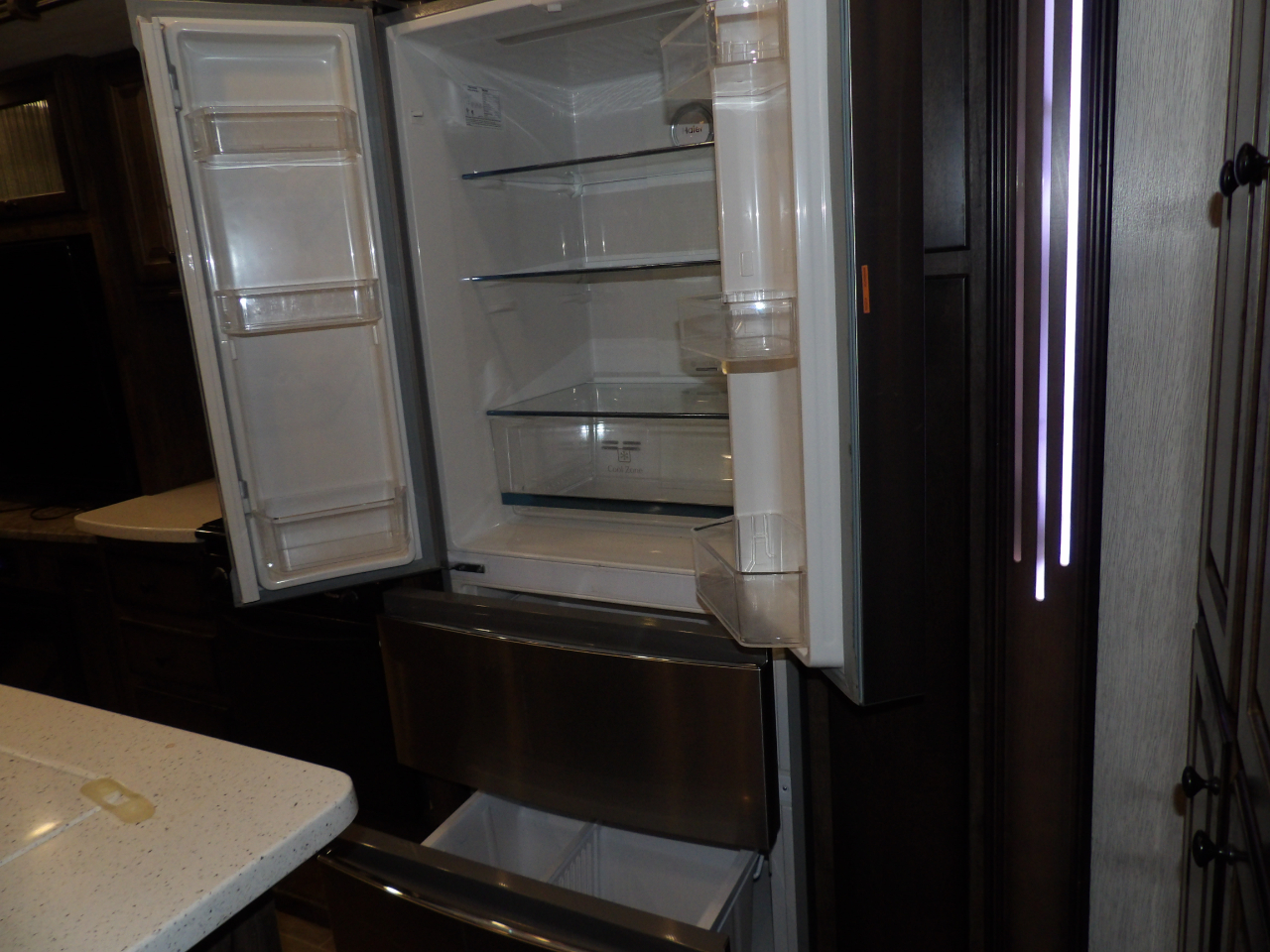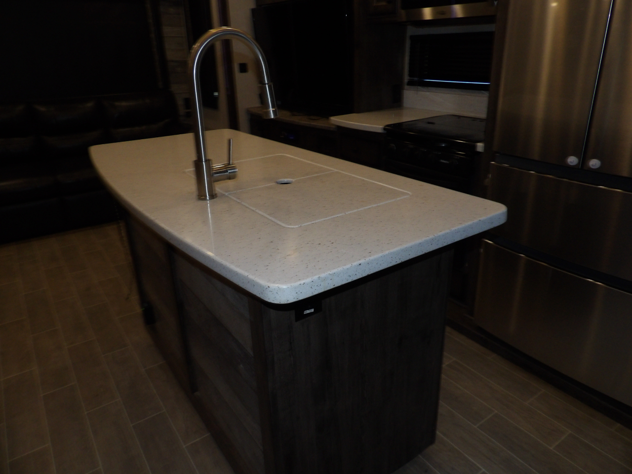 The heart of this fifth wheel is the kitchen, equipped with top-of-the-line stainless steel appliances, solid surface countertops, and ample storage for all your culinary essentials. Whether you're a seasoned chef or enjoy the occasional meal preparation, the Bighorn 39MB ensures every moment in the kitchen is a pleasure.